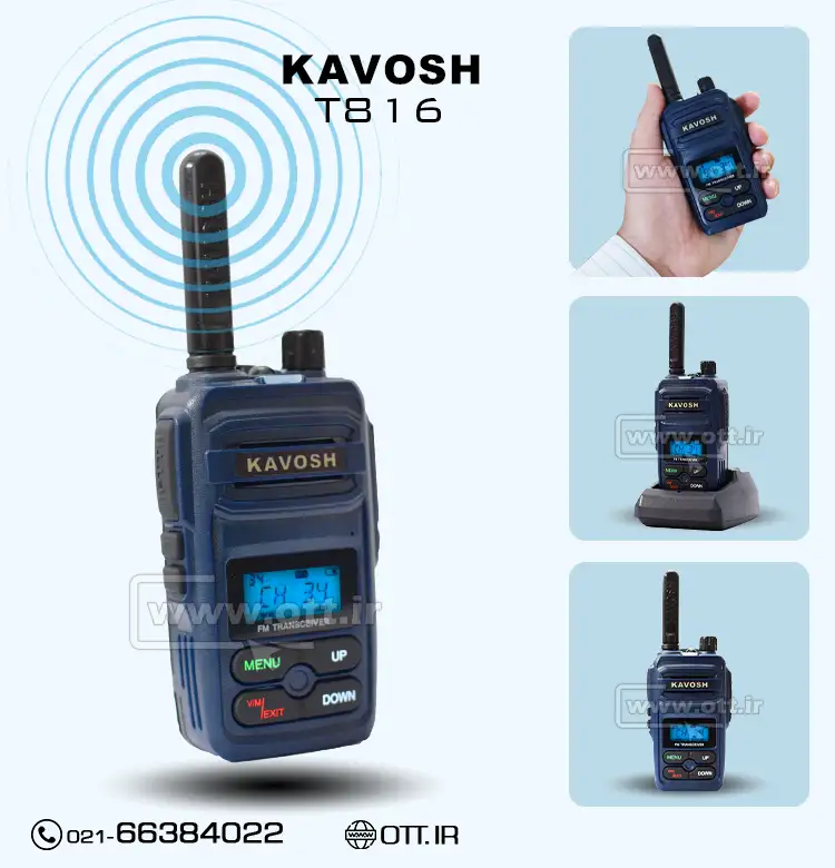 بیسیم واکی تاکی مجاز مدل KAVOSH T816 با ۳۵ کانال در باند فرکانسی UHF و بازه فرکانس 433.5~433 مگاهرتز طراحی شده تا در فضاهای باز، کارگاهها یا آفرود، ارتباطی پایدار و بدون نویز برقرار کند. در بخش امنیتی، این مدل با سیستم کدگذاری اختصاصی ضد شنود از حریم مکالمات محافظت میکند. همچنین وجود صفحه نمایش LCD با نور پس زمینه به کاربر اجازه میدهد بهراحتی وضعیت شارژ، کانال فعال و تنظیمات منو را مشاهده کند. افزون بر این، امکانات جانبی نظیر چراغ قوه و رادیوی FM آن را به ابزاری کاربردی در مأموریتهای شبانه یا فعالیتهای طبیعتگردی تبدیل کرده است. منبع تغذیهی این بیسیم، یک باتری لیتیومی با ظرفیت 1250 میلی آمپر است که قابل شارژ با پایه رومیزی می باشد.